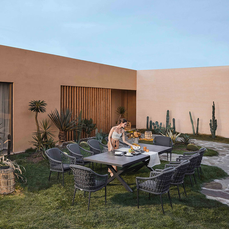 This collection innovates by polyester rope weave or reed resin wicker weave combining with the powder coated aluminum frame and the exposed cushions.